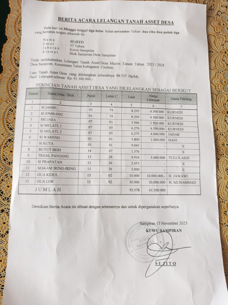 Sampiran — Kuwu Desa Sampiran, Sujito, akhirnya memberikan klarifikasi resmi terkait munculnya pemberitaan miring di salah satu media yang menuduh dirinya meraup keuntungan jutaan rupiah dari pengelolaan tanah desa. Sujito menegaskan bahwa tuduhan tersebut tidak benar dan telah menimbulkan kesalahpahaman di tengah masyarakat.